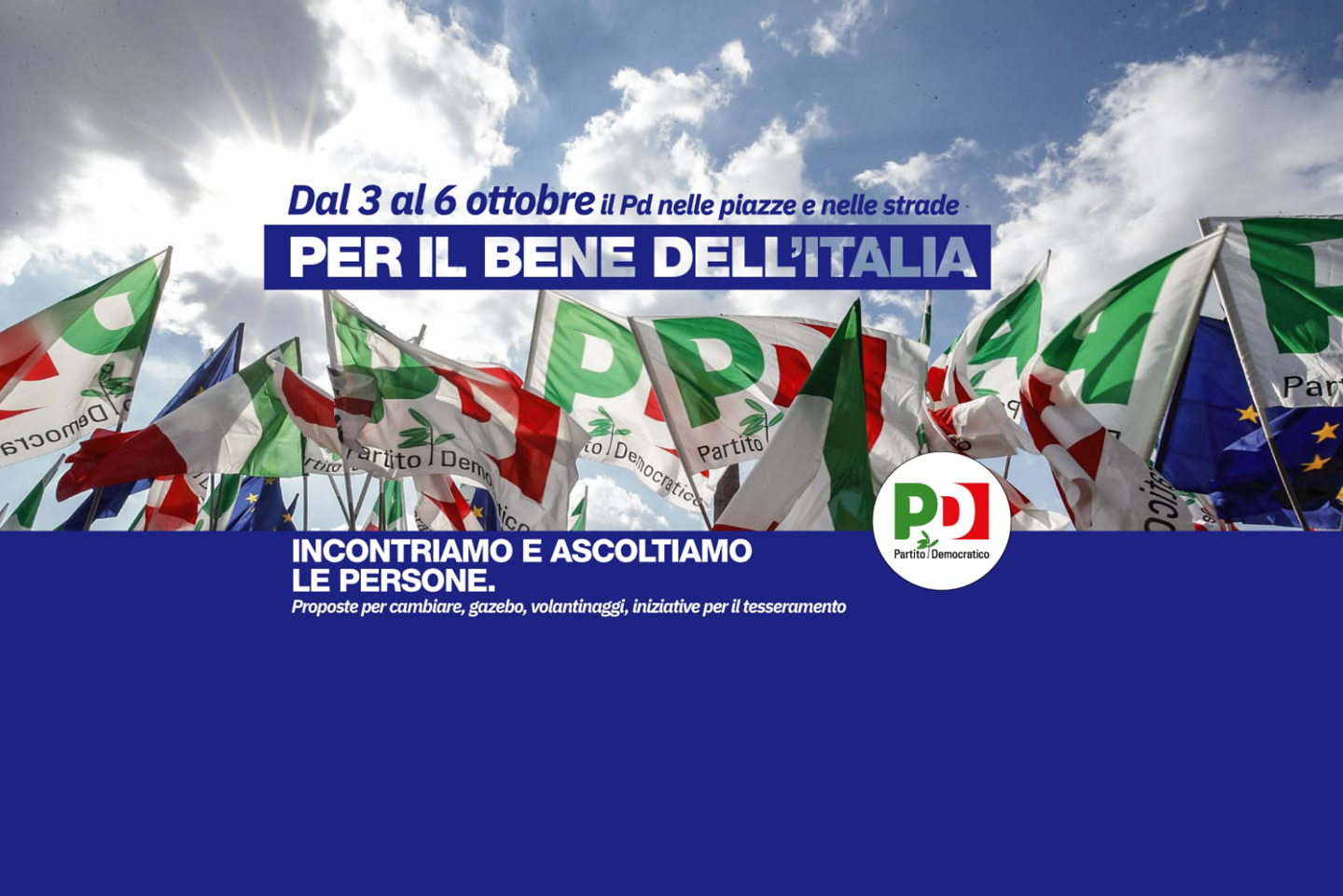 Dal 3 al 6 Ottobre il Partito Democratico scenderà in tutte le piazze e le strade d'Italia per presentare le sue proposte, discutere e ascoltare la voce degli italiani.